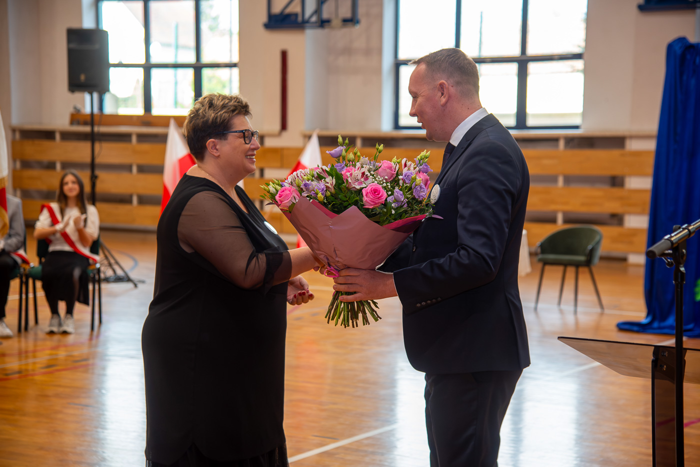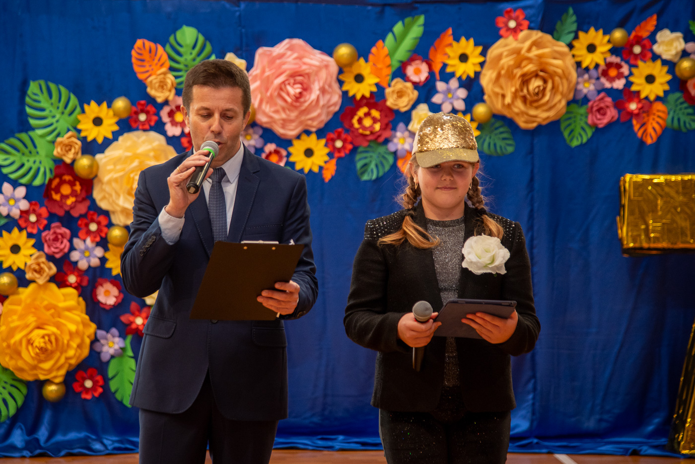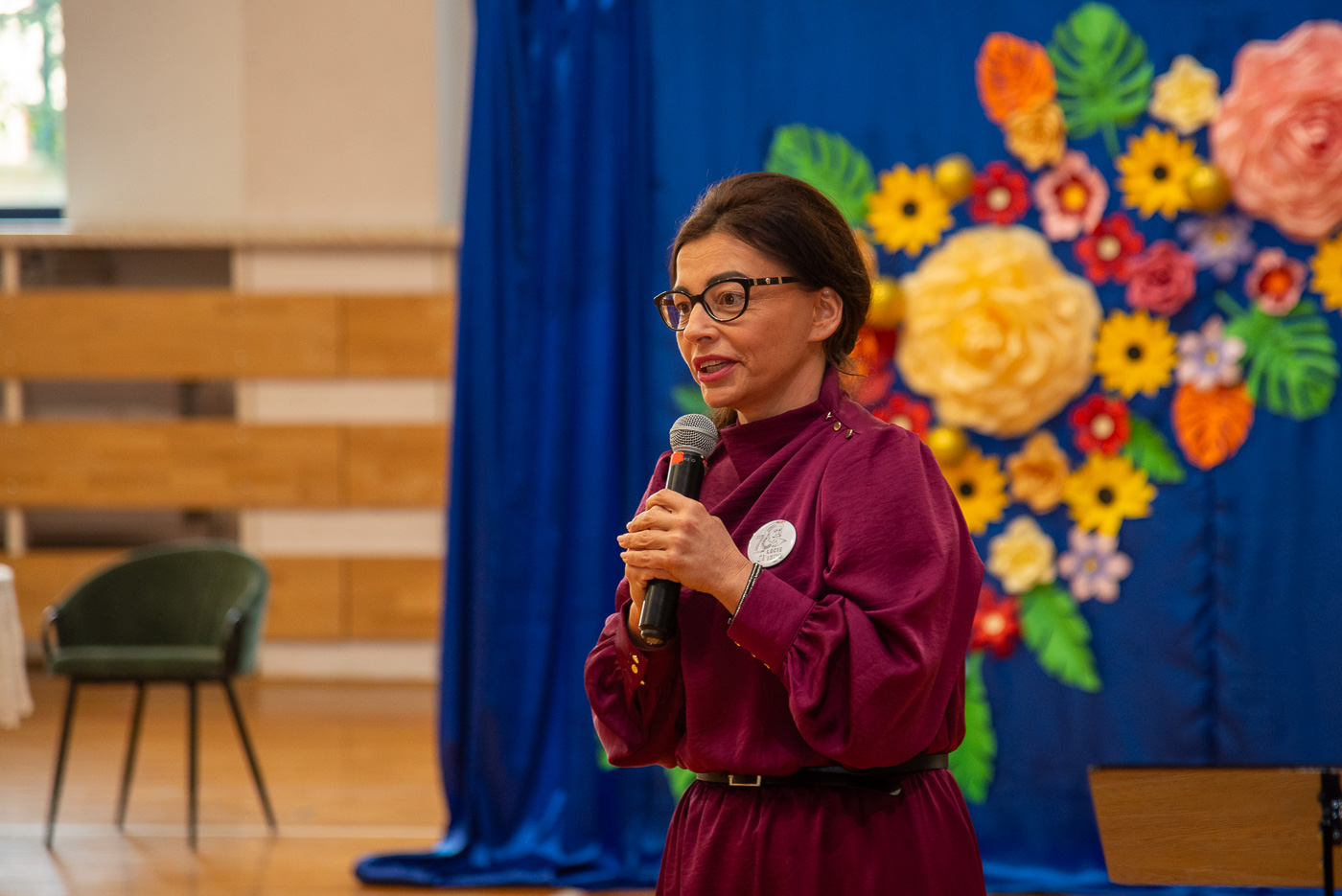 Dyrektor szkoły Jolanta Medycka, w swoim przemówieniu podkreśliła znaczenie 70-letniej działalności placówki dla życia całej gminy. Mówiła jak szkoła się zmieniła i jednocześnie jak pozostała sobą, bo najważniejsi są wciąż ludzie: nauczyciele, uczniowie, rodzice i wszyscy ci, którzy z sercem i pasją tworzą naszą szkolną wspólnotę. Warto przywołać tu słowa Zbigniewa Herberta: „Bądź wierny! Idź!”. To krótkie zdanie niesie w sobie wszystko, co przez 70 lat było istotą naszej szkoły – wierność wartościom, tradycji, wspólnocie i odwaga, by iść dalej, rozwijać się, szukać nowych dróg.