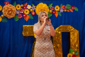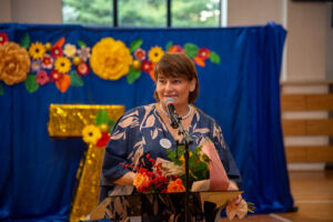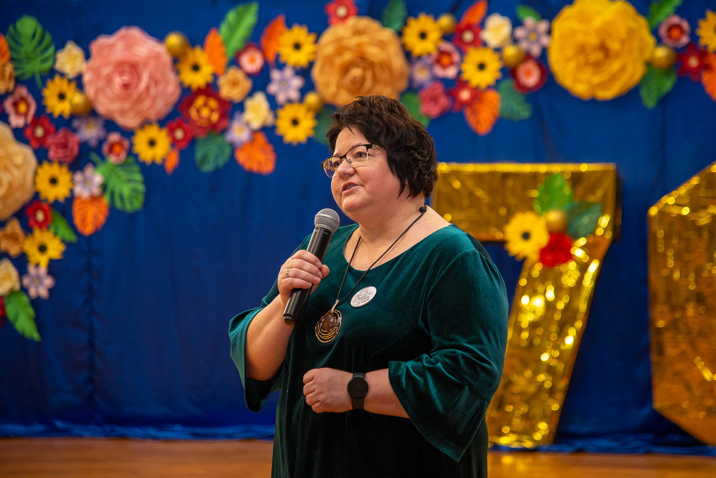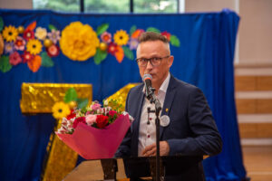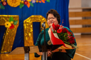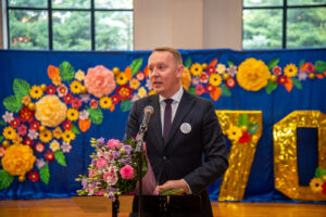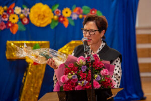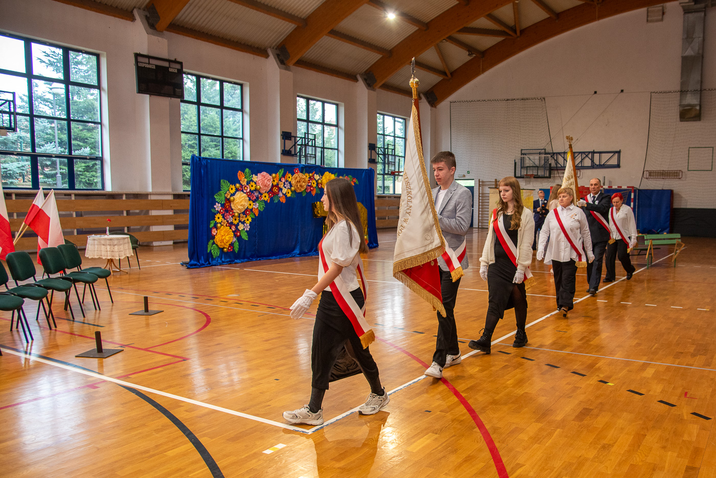 Dyrektor szkoły Jolanta Medycka, w swoim przemówieniu podkreśliła znaczenie 70-letniej działalności placówki dla życia całej gminy. Mówiła jak szkoła się zmieniła i jednocześnie jak pozostała sobą, bo najważniejsi są wciąż ludzie: nauczyciele, uczniowie, rodzice i wszyscy ci, którzy z sercem i pasją tworzą naszą szkolną wspólnotę. Warto przywołać tu słowa Zbigniewa Herberta: „Bądź wierny! Idź!”. To krótkie zdanie niesie w sobie wszystko, co przez 70 lat było istotą naszej szkoły – wierność wartościom, tradycji, wspólnocie i odwaga, by iść dalej, rozwijać się, szukać nowych dróg.