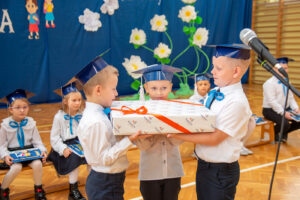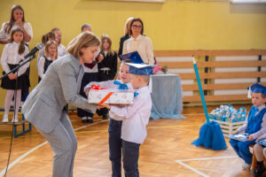 Pani naczelnik składając życzenia, zarówno nauczycielom z okazji ich święta jak i pierwszoklasistom, życząc im wielu sukcesów na nowej drodze edukacji, przekazała prezent od pana burmistrza dla uczniów klasy pierwszej.
