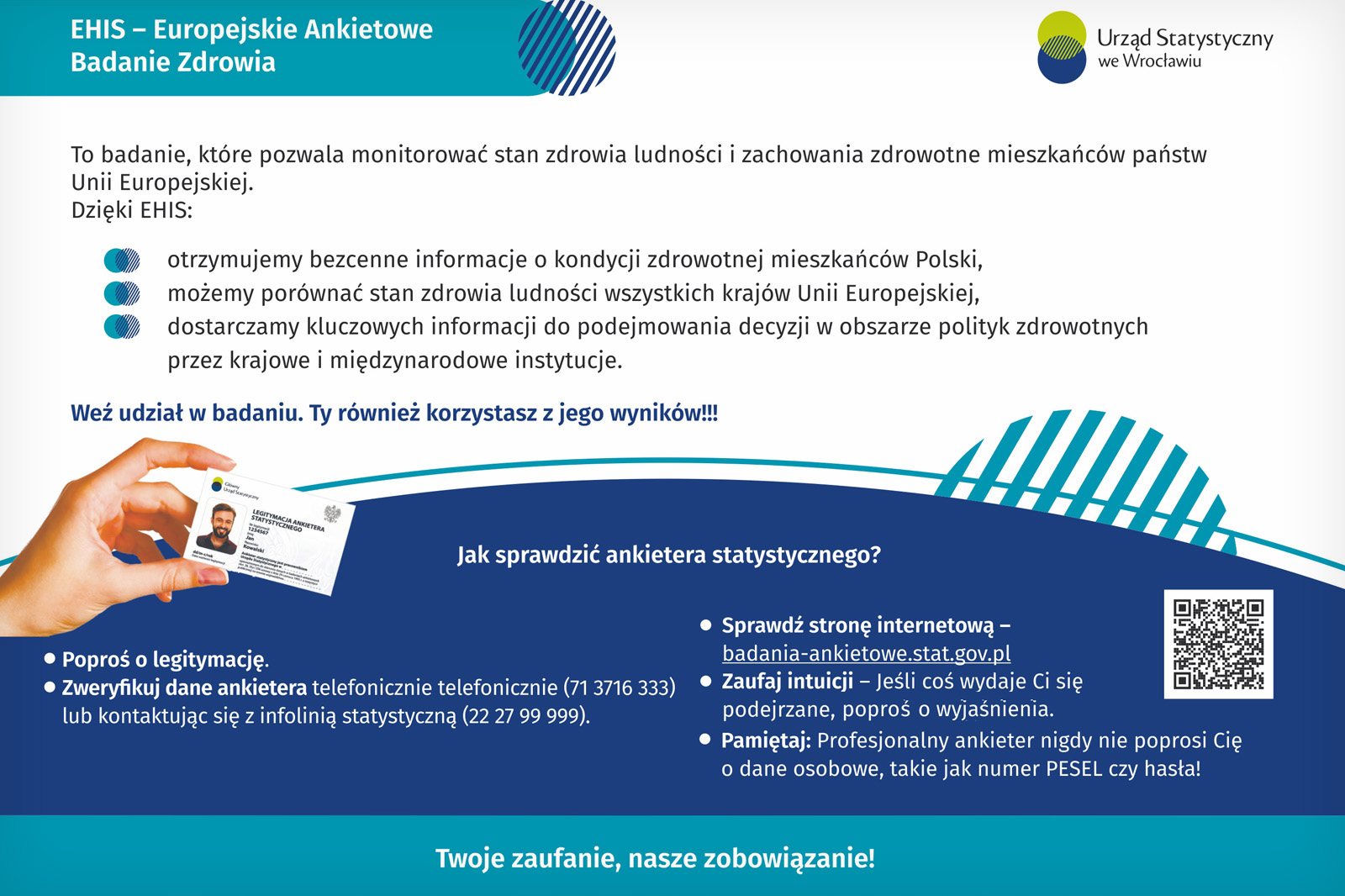 Informujemy, że na terenie naszej gminy prowadzone jest w terminie 1 września – 31 grudnia 2025 r. Europejskie Ankietowe Badanie Zdrowia (EHIS). Jest ono prowadzone co 6 lat we wszystkich krajach Unii Europejskiej, po to, aby można było porównywać wyniki o stanie zdrowia mieszkańców poszczególnych państw.