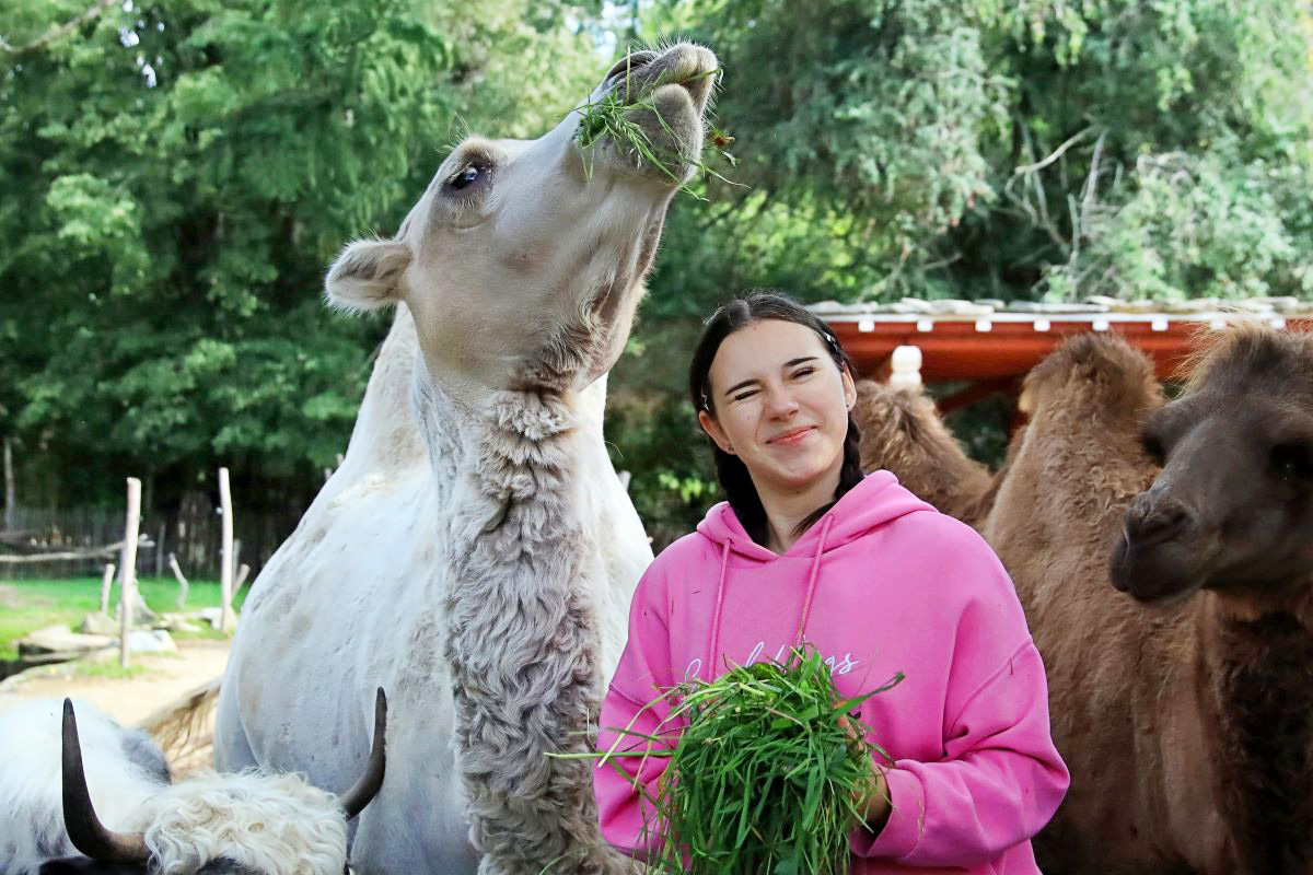 zdjęcie: Dromader i zadowolona zwiedzająca podczas karmienia / G. Drozd www.zoo-goerlitz.de