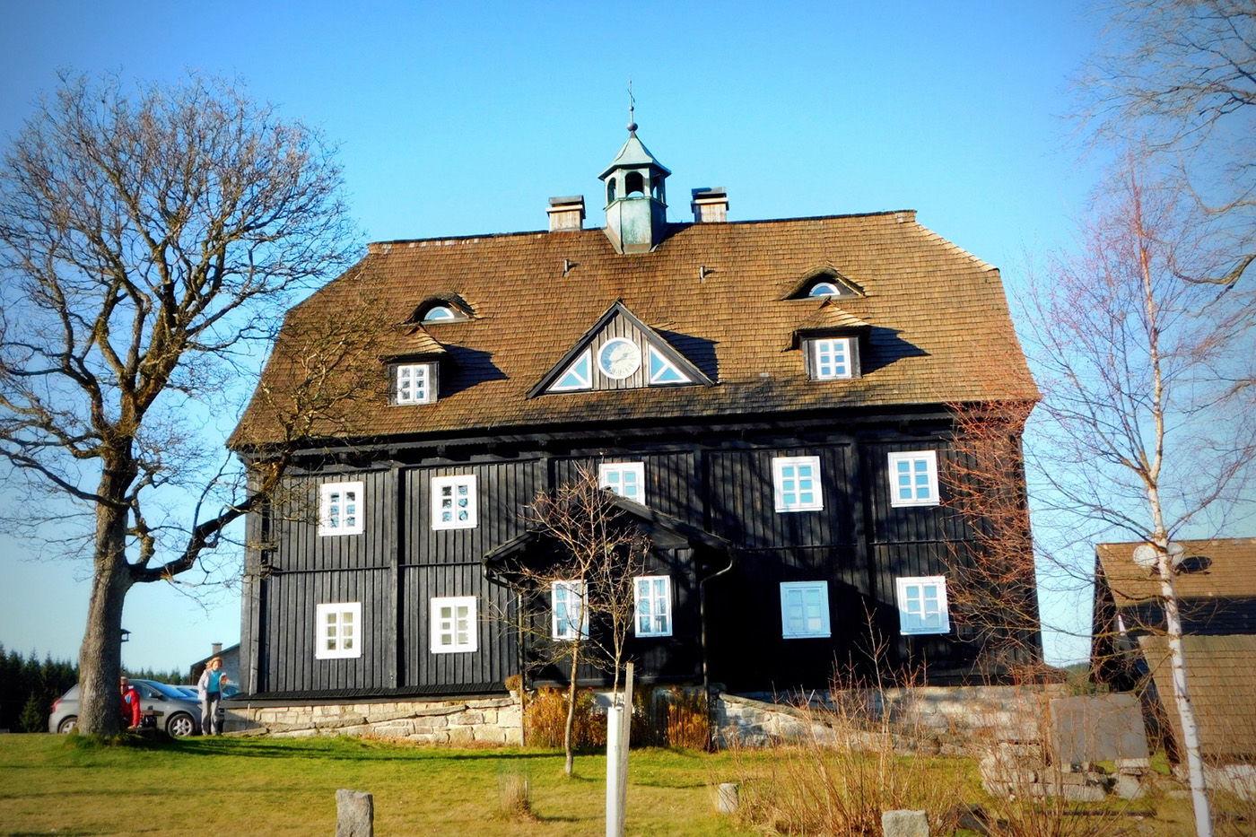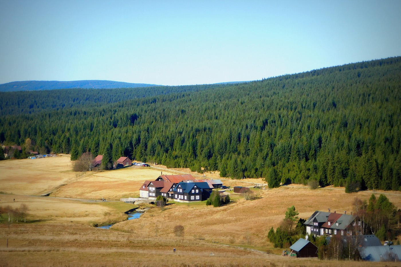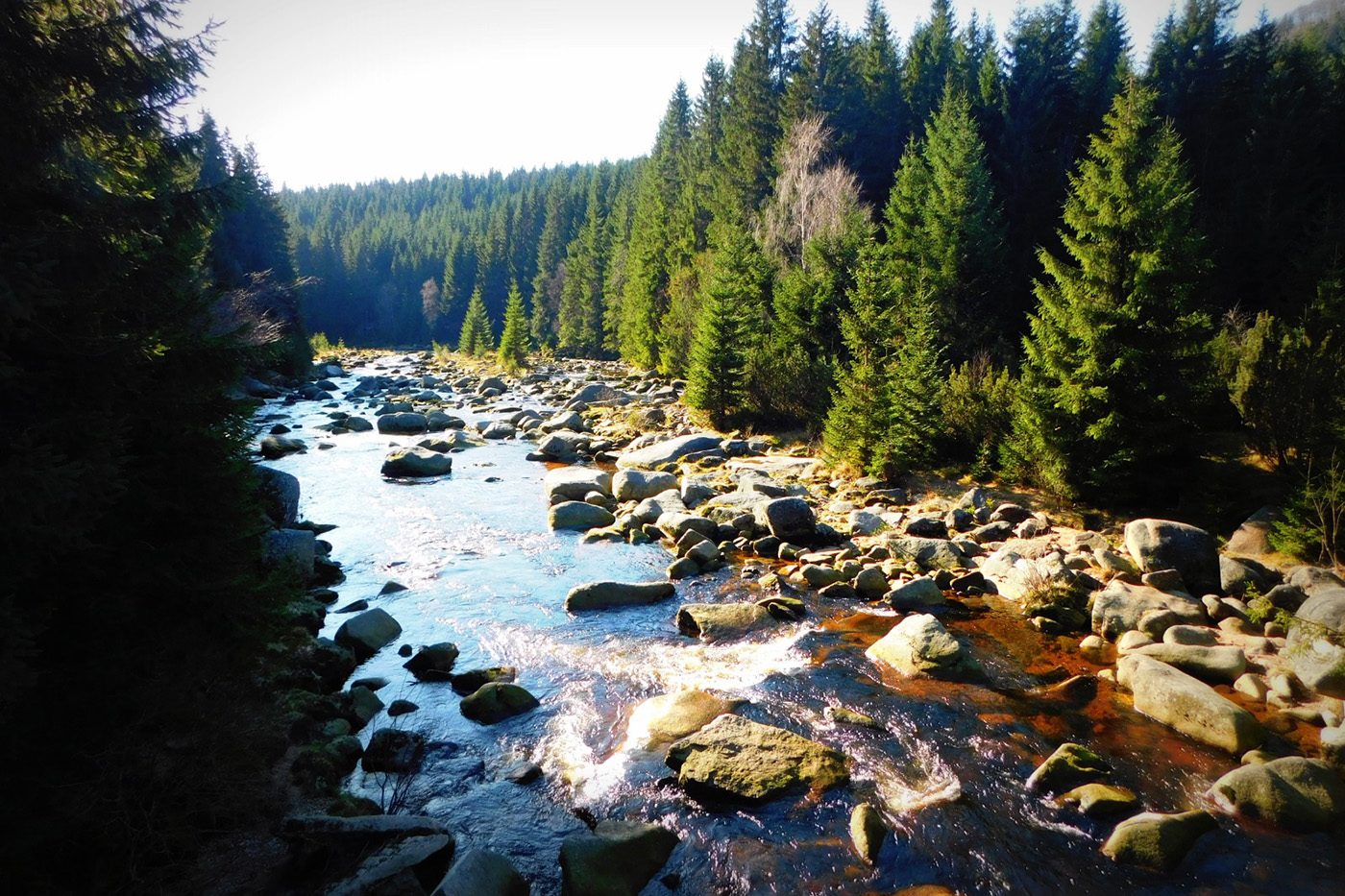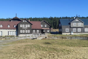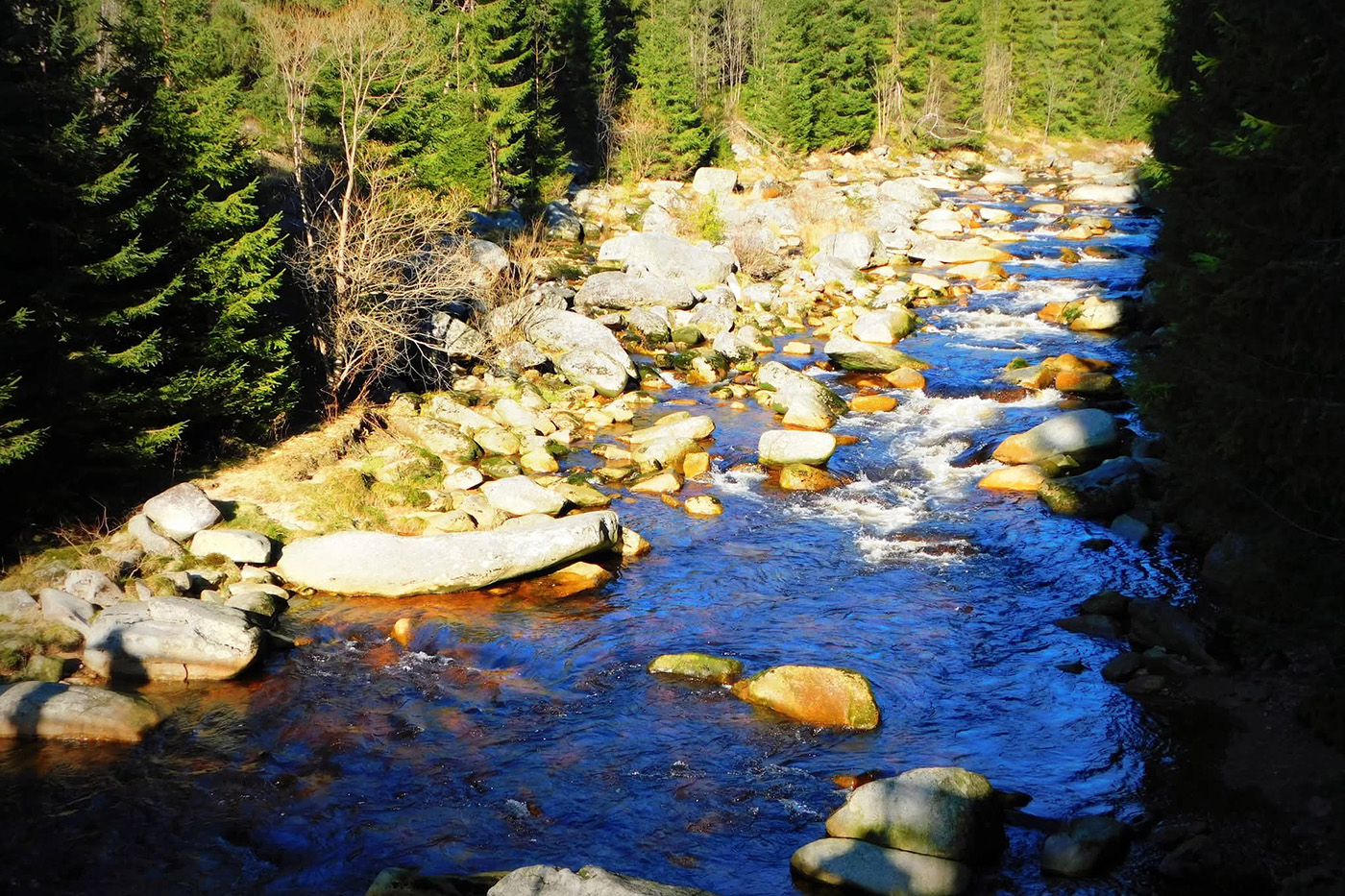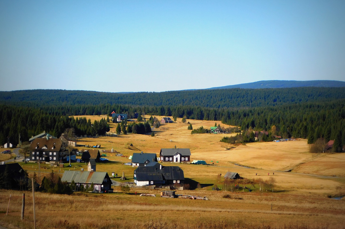 Po drugiej stronie granicznego strumyka czekała Jizerka. Ta osada ma w sobie coś z osobnego świata: zimą wygląda jak kartka świąteczna, a wiosną rozkłada przed człowiekiem dywany żonkilów, jakby las szykował się na galę. Jesienią, którą trafiliśmy my, całość skąpana była w złocistej poświacie. Słońce przesączało się przez gałęzie i rozsypywało światło po drodze jak garść monet z nieba. Tylko brać i iść dalej.