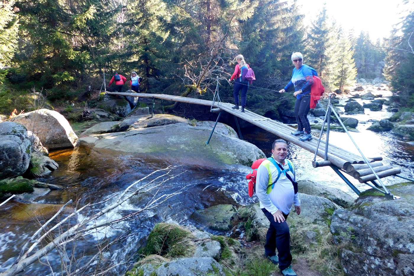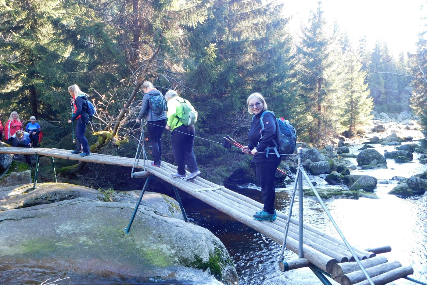 Pierwszy punkt programu okazał się bardziej emocjonujący, niż zakładaliśmy. Ruchomy mostek nad Izerą lekko zafalował pod naszym ciężarem, jakby pytał: „To na pewno dobry pomysł?”. My oczywiście odpowiedzieliśmy mu gromkim „Oczywiście!”, chociaż kilka par kolan miało na ten temat swoje własne, lekko drżące opinie. Przeprawa zakończyła się pełnym sukcesem i jeszcze pełniejszą dawką adrenaliny, która ogrzewała nas lepiej niż termos herbaty.