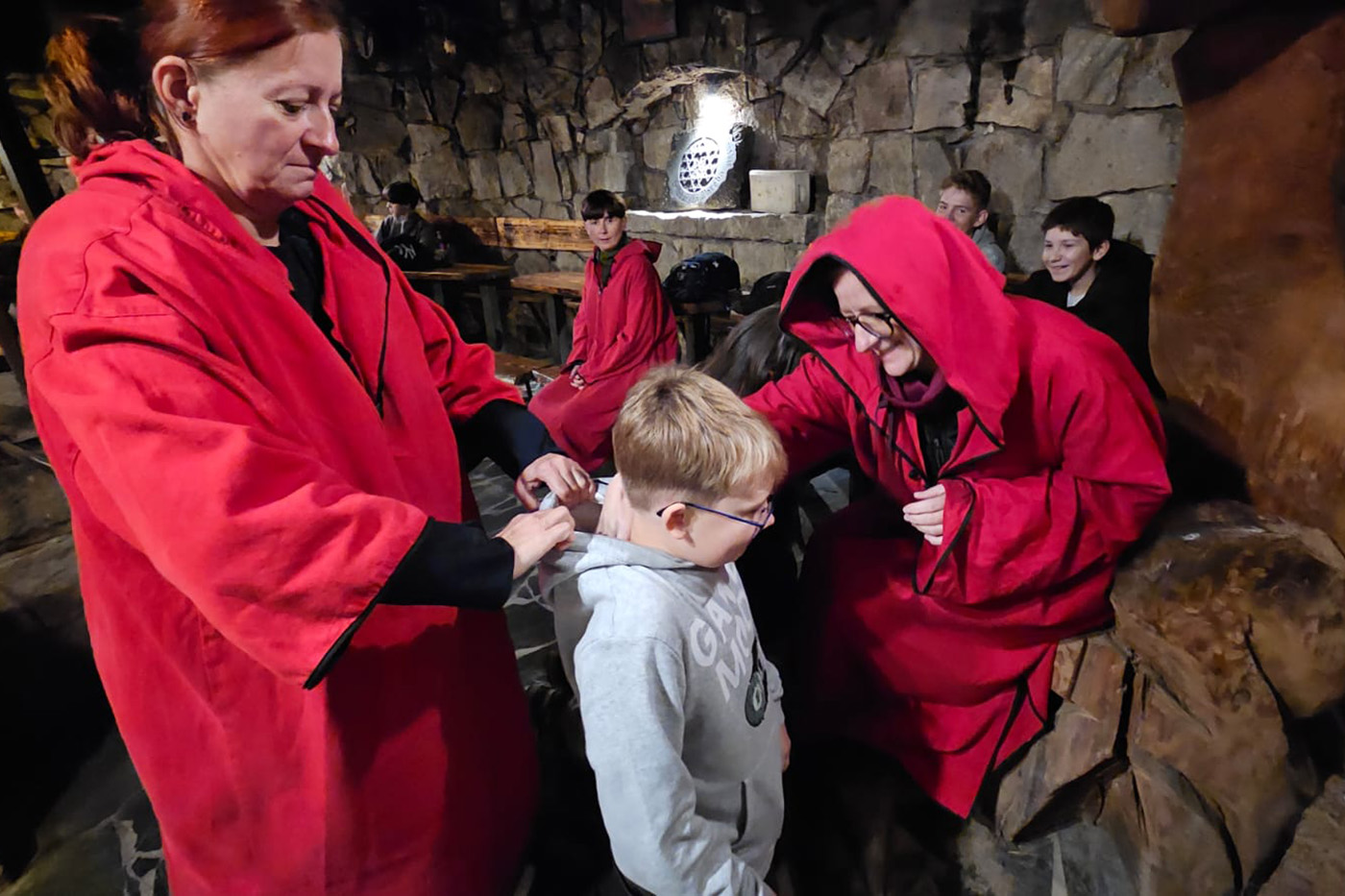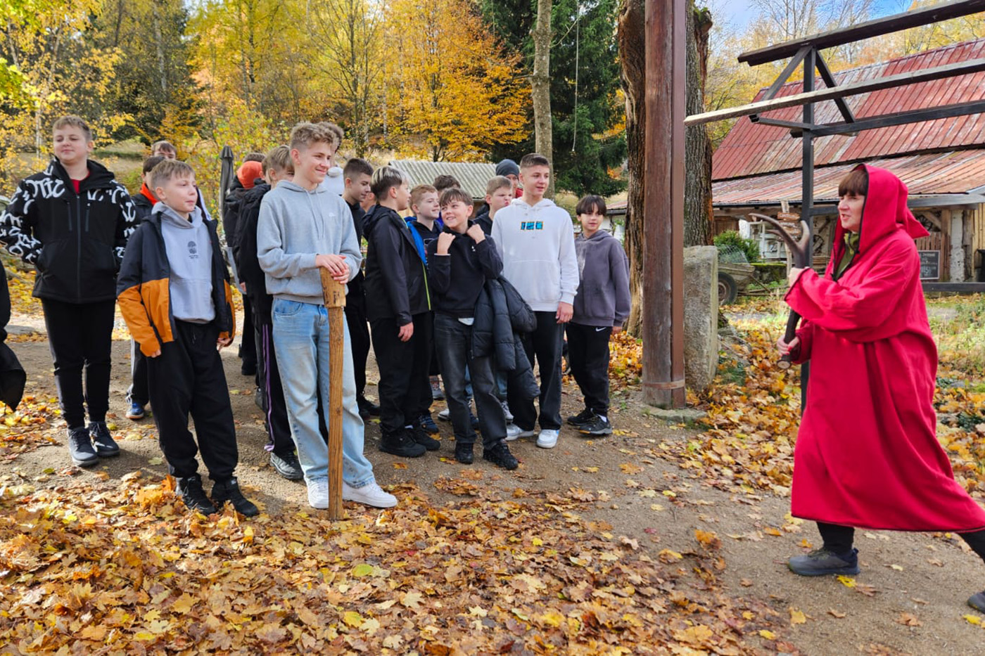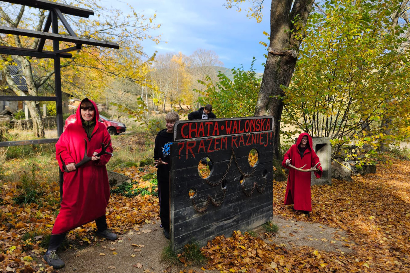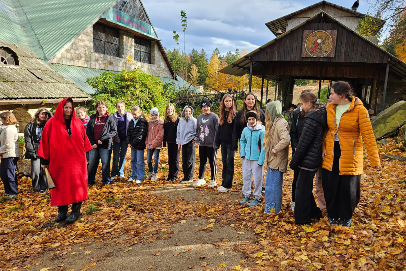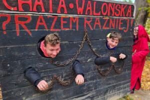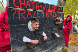 Na początek odwiedzili Starą Chatę Walońską, gdzie przeszli przez niezwykły rytuał waloński. Chłopcy tak donośnie wołali: „Kocham Matkę Naturę!”, że – jak wszyscy żartowali – w Bogatyni było ich słychać! Trzy wiedźmy, które uczniowie spotkali podczas rytuału, dziwnie przypominały im kogoś znajomego… ale kto to mógł być? Śmiechu było co niemiara!