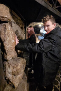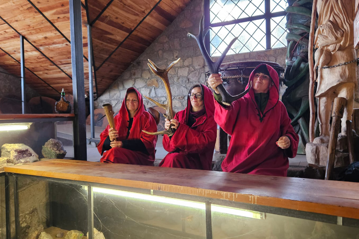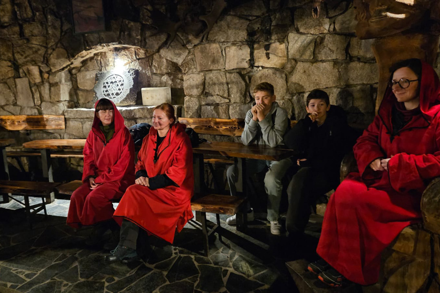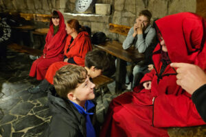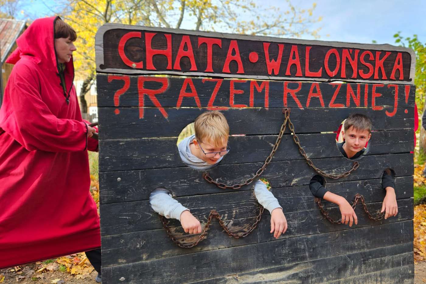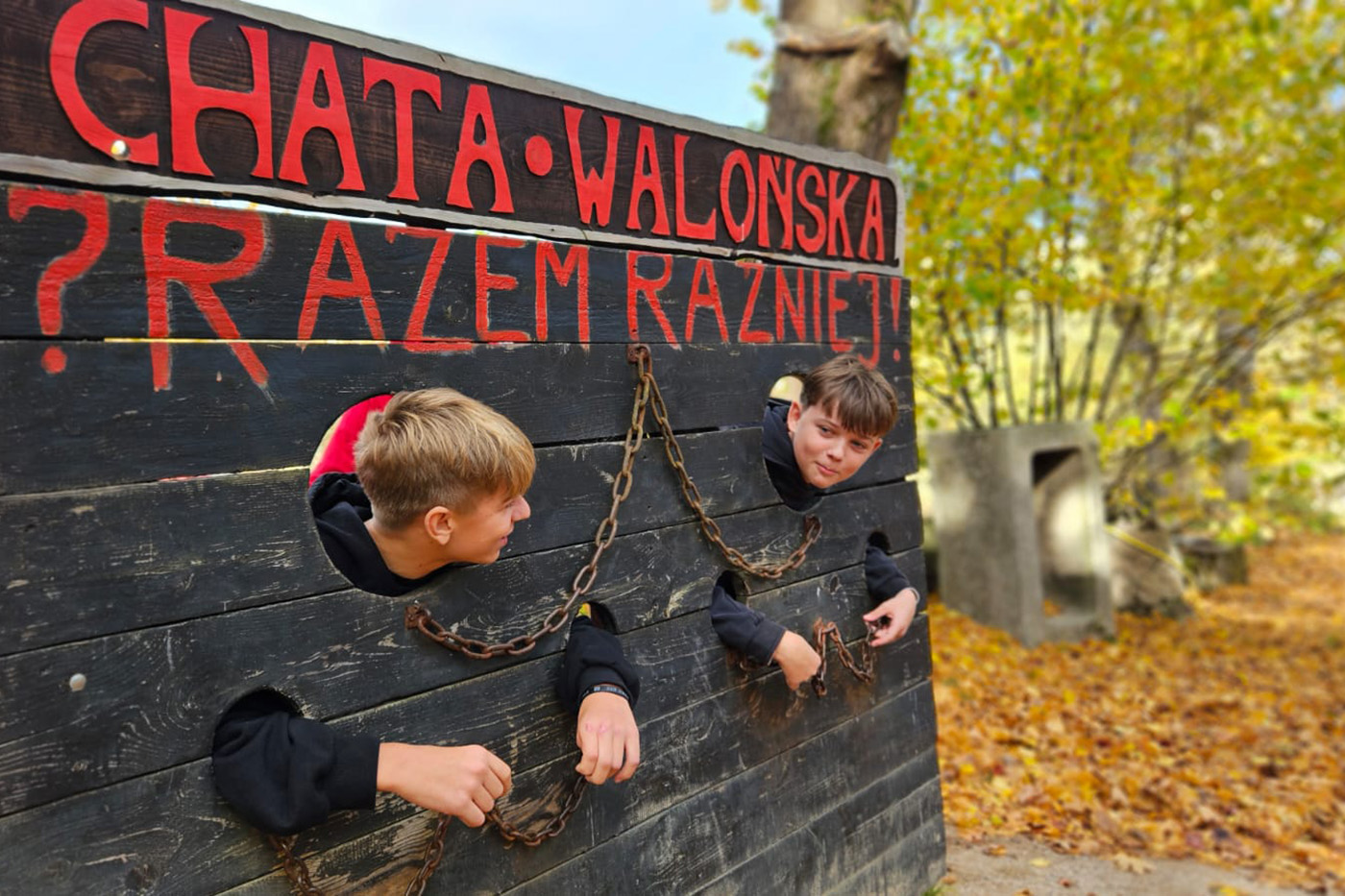 Na początek odwiedzili Starą Chatę Walońską, gdzie przeszli przez niezwykły rytuał waloński. Chłopcy tak donośnie wołali: „Kocham Matkę Naturę!”, że – jak wszyscy żartowali – w Bogatyni było ich słychać! Trzy wiedźmy, które uczniowie spotkali podczas rytuału, dziwnie przypominały im kogoś znajomego… ale kto to mógł być? Śmiechu było co niemiara!