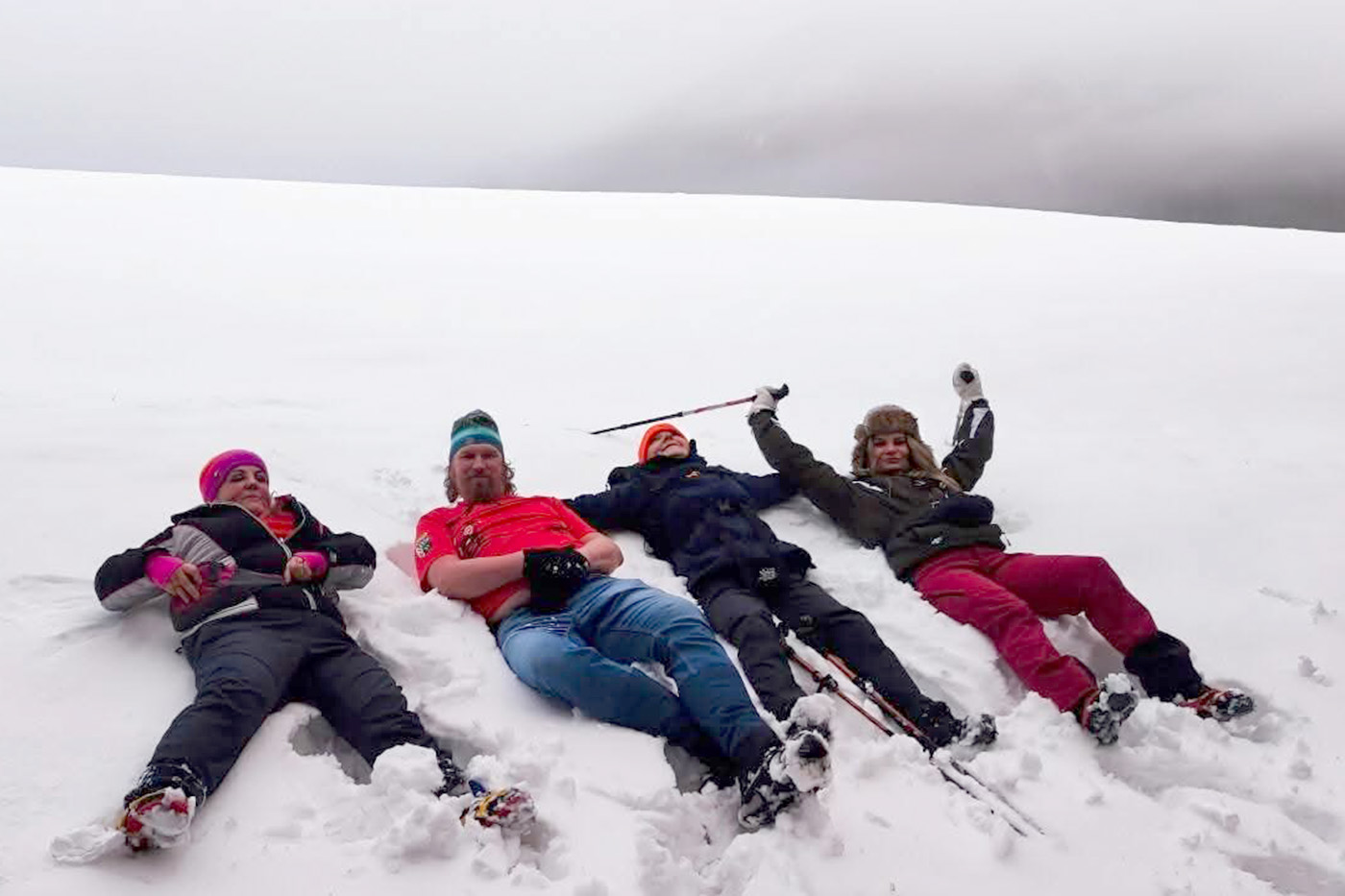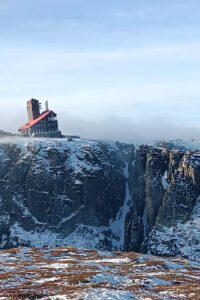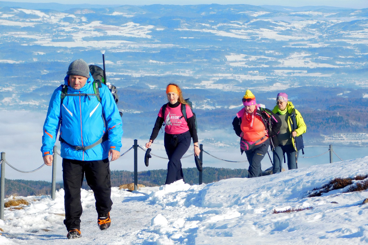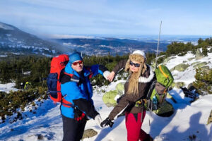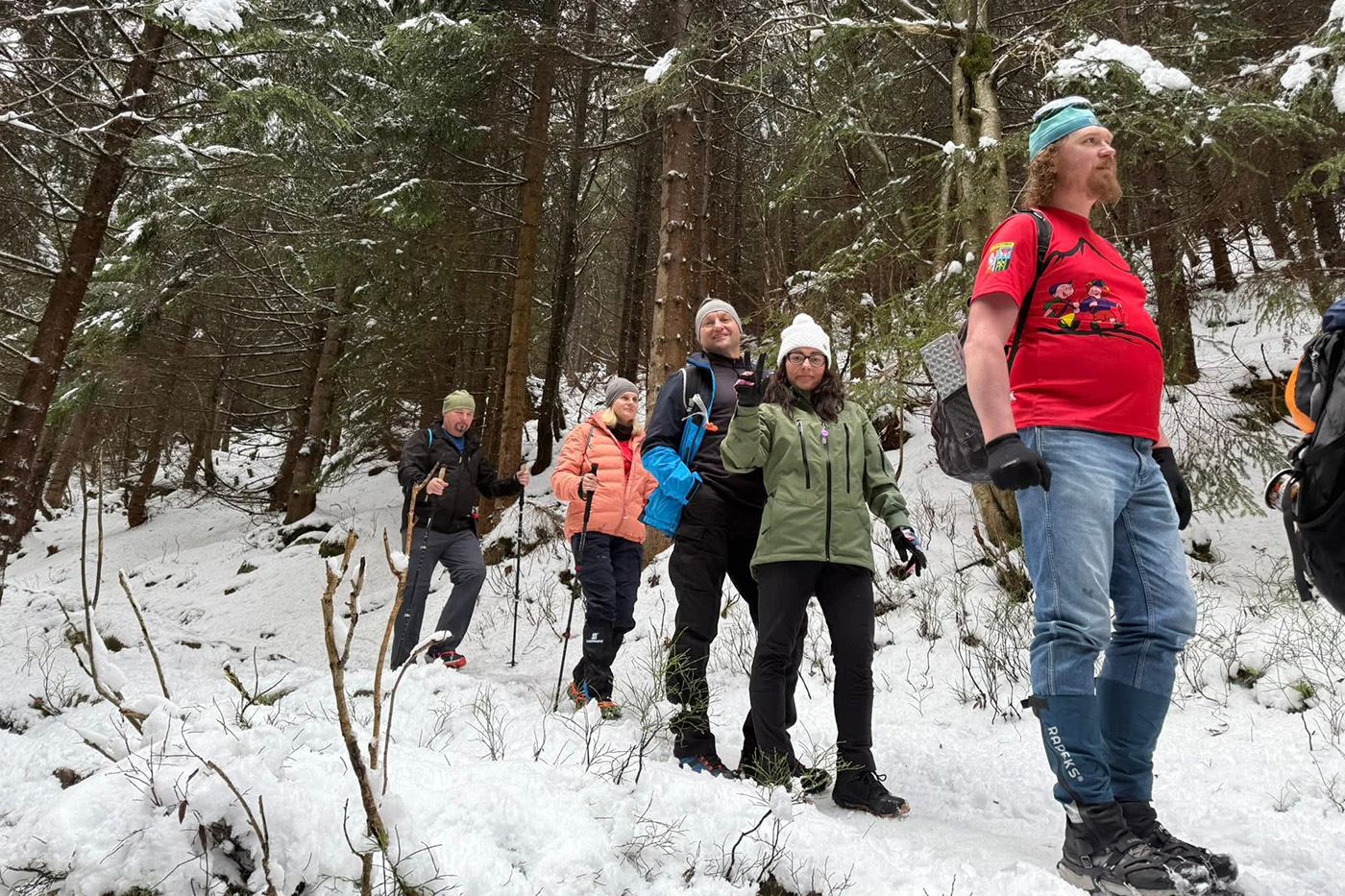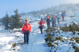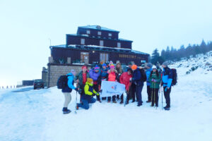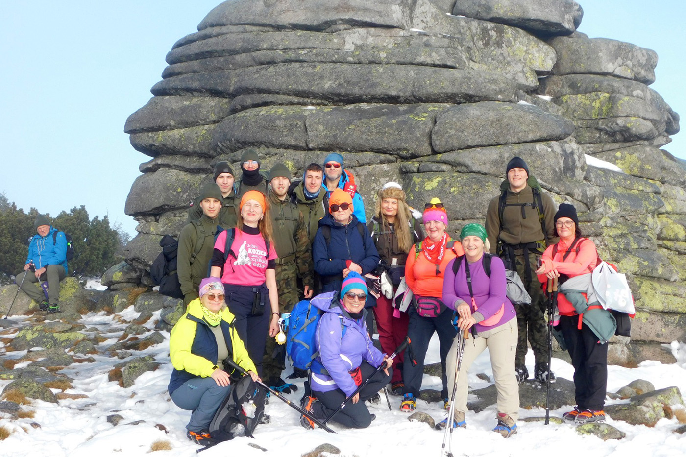 Niedzielny poranek powitał nas najpierw mgłą, później piękną słoneczną pogodą i prawdziwym zimowym krajobrazem Karkonoszy. Po śniadaniu ruszyliśmy czerwonym szlakiem Głównym Szlakiem Sudeckim, prowadzącym malowniczym grzbietem gór. Wspaniałe panoramy towarzyszyły nam przez całą drogę. Szczególne wrażenie zrobiły Śnieżne Kotły – monumentalne, polodowcowe ściany w zimowej szacie, które przypominały prawdziwą górską katedrę. Dalej przeszliśmy trasa zimową do schroniska Pod Łabskim Szczytem, skąd rozpoczęliśmy zejście do Szklarskiej Poręby. Śnieg, słońce i widoki sprawiły, że wędrówka była czystą przyjemnością.