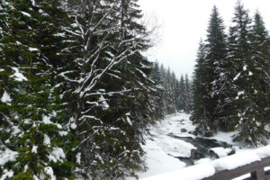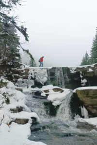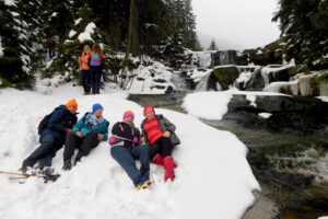 Najpierw dotarliśmy do schroniska Odrodzenie, gdzie zostawiliśmy cięższe plecaki i przygotowaliśmy się do pierwszej trasy. Po krótkim odpoczynku ruszyliśmy w stronę wodospadów Białej Łaby. Zimowa aura sprawiła, że kaskady i potoki były częściowo skute lodem, tworząc przepiękne lodospady i malownicze formacje lodowe. Trasa prowadziła wzdłuż doliny, a zimowa szata Karkonoszy od razu wprowadziła nas w wyjątkowy klimat wyprawy.