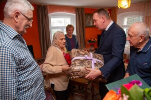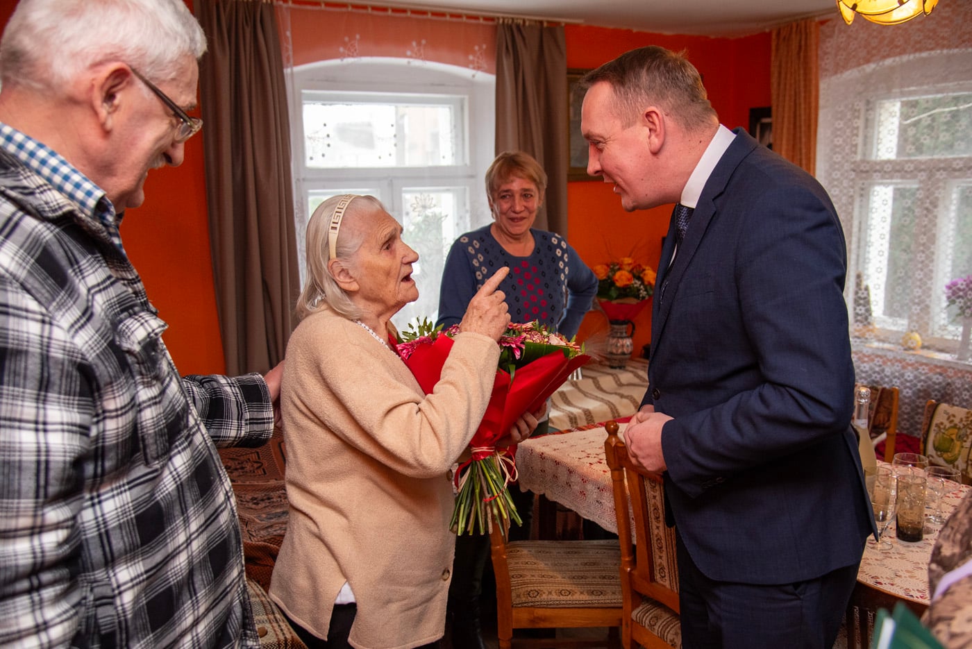 Podczas spotkania burmistrz złożył serdeczne gratulacje oraz przekazał życzenia zdrowia, pogody ducha i wielu kolejnych lat spędzonych w otoczeniu bliskich. Z tej okazji wręczył Jubilatce kwiaty oraz upominek.