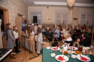 Modlitwę poprowadził ks. Krzysztof Zambroń, po której wszyscy połamali się opłatkiem i złożyli sobie życzenia. Następnie uczestnicy wspólnie śpiewali kolędy i pastorałki. Na początku wystąpiła Zosia Klimowicz, uczennica Szkoły Podstawowej w Działoszynie, a po jej występie wszyscy zebrani śpiewali a capella z przygotowanych śpiewników.