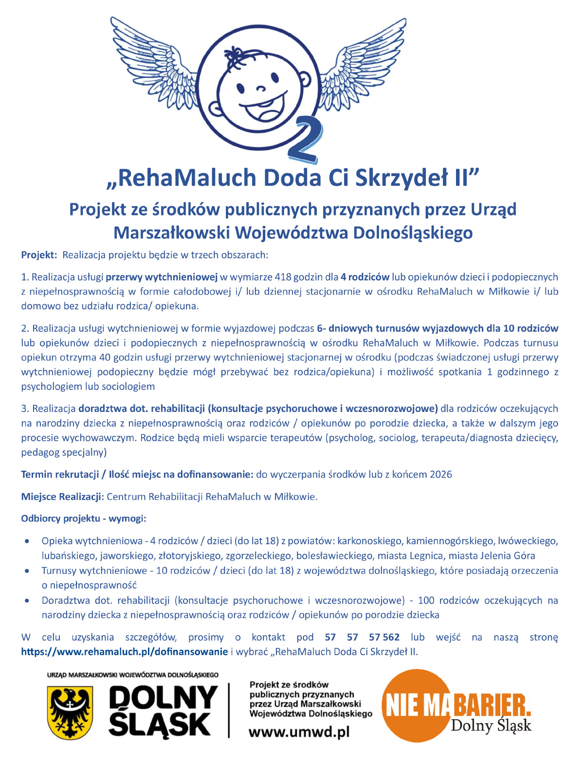 1. Opieka wytchnieniowa – 4 rodziców / dzieci (do lat 18) z powiatów: karkonoskiego, kamiennogórskiego, lwóweckiego, lubańskiego, jaworskiego, złotoryjskiego, zgorzeleckiego, bolesławieckiego, miasta Legnica, miasta Jelenia Góra,
