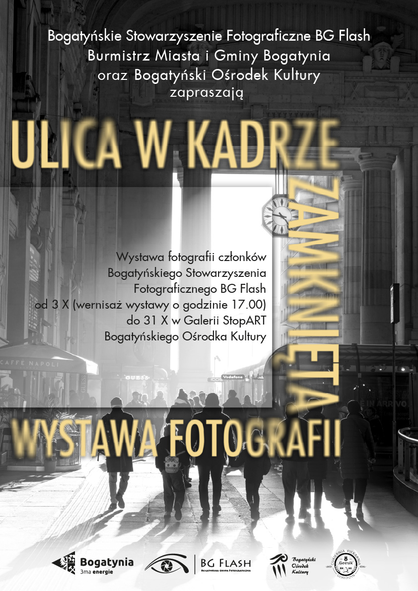 Bogatyńskie Stowarzyszenie BG Flash, Burmistrz Miasta i Gminy Bogatynia oraz Bogatyński Ośrodek Kultury zapraszają na wystawę fotografii „Ulica w kadrze zamknięta”.