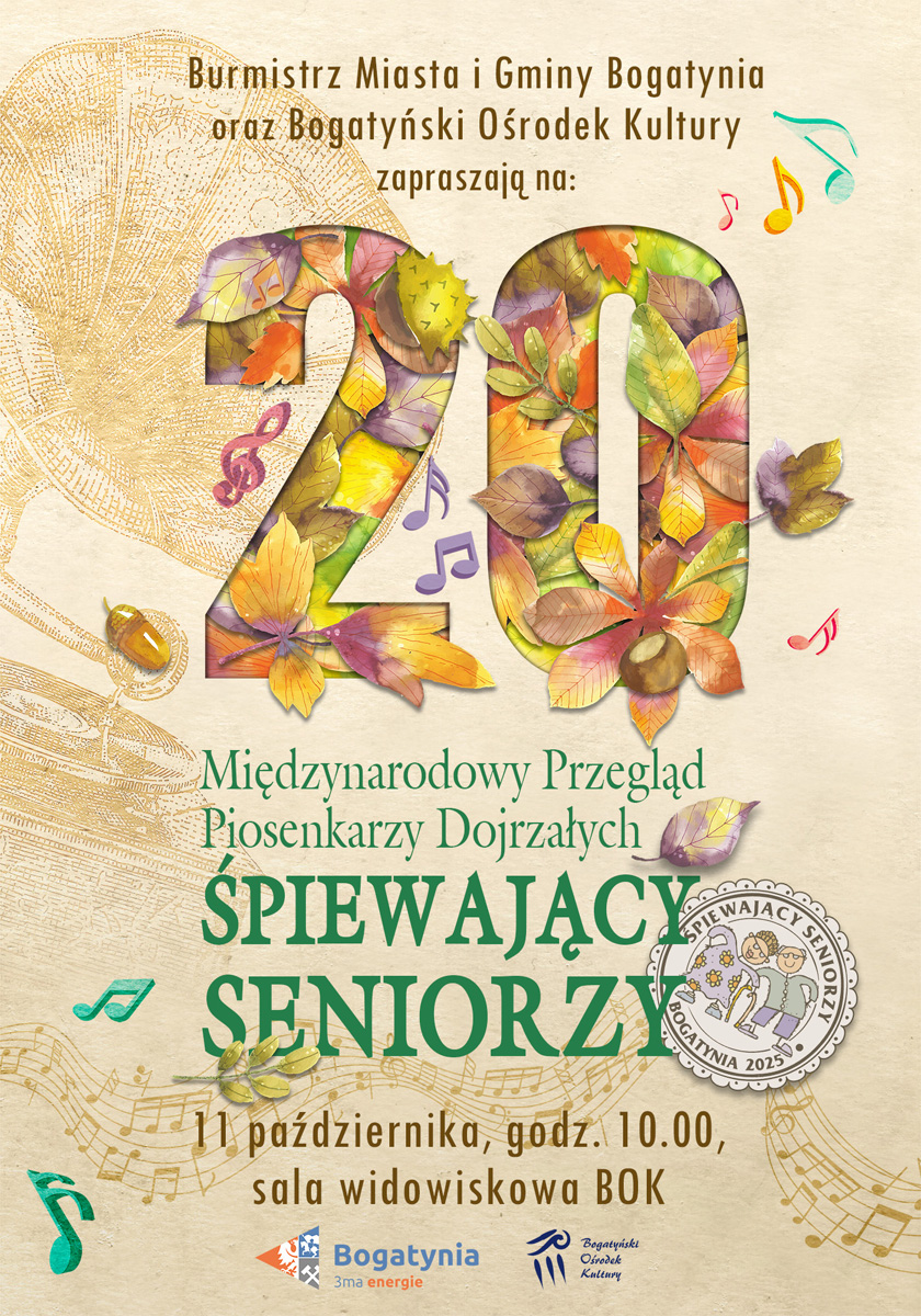 Uprzejmie informujemy, że tegoroczny XX Międzynarodowy Przegląd Piosenkarzy Dojrzałych „Śpiewający Seniorzy” odbędzie się 11 października br. (sobota) o godzinie 10.00 w Bogatyńskim Ośrodku Kultury.